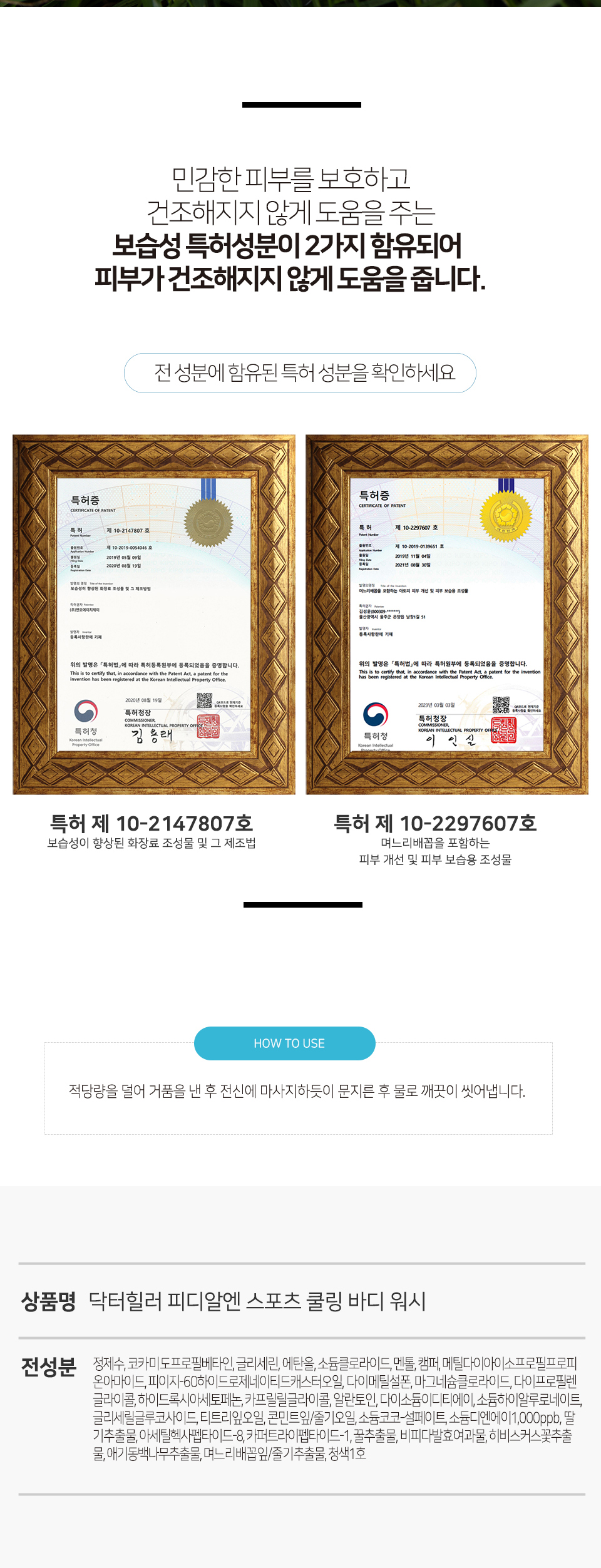 전성분 정제수, 코카미도프로필베타인, 글리세린, 에탄올, 소듐클로라이드, 멘톨, 캠퍼, 메틸다이아이소프로필프로피온아마이드, 피이지-60하이드로제네이티드캐스터오일, 다이메틸설폰, 마그네슘클로라이드, 다이프로필렌글라이콜, 하이드록시아세토페논, 카프릴릴글라이콜, 알란토인, 다이소듐이디티에이, 소듐하이알루로네이트, 글리세릴글루코사이드, 티트리잎오일, 콘민트잎/줄기오일, 소듐코코-설페이트, 소듐디엔에이1,000ppb, 딸기추출물, 아세틸헥사펩타드-8, 카퍼트라이펩타이드-1, 꿀추출물, 비피다발효여과물, 히비스커스꽃추출물, 애기동백나무추출물, 며느리배꼽잎/줄기추출물, 청색1호