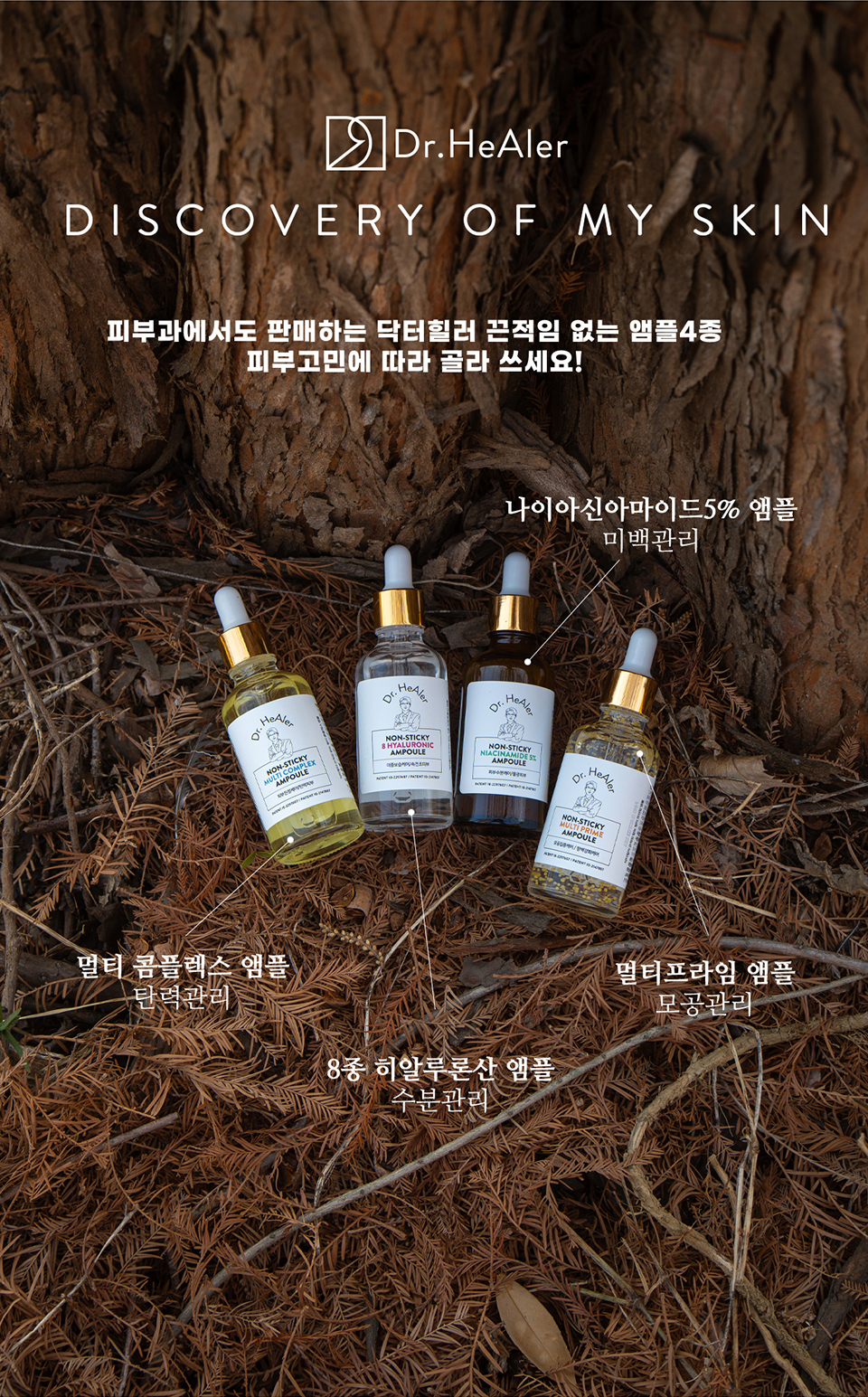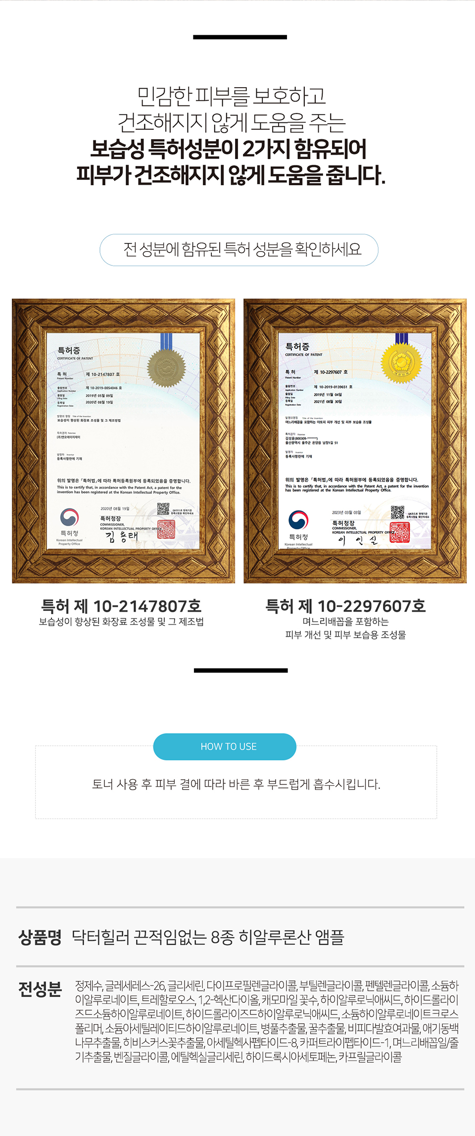 | 전성분 | 끈적임 없는 나이아신아마이드5% 앰플 전성분 : 정제수, 나이아신아마이드5%, 부틸렌글라이콜, 글리세린, 소듐하이알루로네이트, 1,2-헥산다이올, 소듐구아이아줄렌설포네이트, 알란토인, 알지닌, 꿀추출물, 비피다발효여과물, 애기동백나무추출물, 히비스커스꽃추출물, 병풀추출물, 아세틸헥사펩타이드-8, 카퍼트라이펩타이드-1, 카보머, 암모늄아크릴로일다이메틸타우레이트/브이피코폴리머, 다이소듐이디티에이, 카프릴릴글라이콜, 피이지-60하이드로제네이티드캐스터오일, 클로페네신, 며느리배꼽잎/줄기추출물, 향료, 헥실신남알, 시트로넬올 끈적임 없는 8종 히알루론산 앰플 전성분 : 정제수, 글레세레스-26, 글리세린, 다이프로필렌글라이콜, 부틸렌글라이콜, 펜텔렌글라이콜, 소듐하이알루로네이트, 트레할로오스, 1,2-헥산다이올, 캐모마일 꽃수, 하이알루로닉애씨드, 하이드롤라이즈드소듐하이알루로네이트, 하이드롤라이즈드하이알루로닉애씨드, 소듐하이알루로네이트크로스폴리머, 소듐아세틸레이티드하이알루로네이트, 병풀추출물, 꿀추출물, 비피다발효여과물, 애기동백나무추출물, 히비스커스꽃추출물, 아세틸헥사펩타이드-8, 카퍼트라이펩타이드-1, 며느리배꼽일/줄기추출물, 벤질글라이콜, 에틸헥실글리세린, 하이드록시아세토페논, 카프릴글라이콜 끈적임 없는 멀티 콤플렉스 앰플 전성분 : 정제수, 하이드롤라이즈드콜라겐추출물, 병풀추출물, 글리세린, 부틸렌글라이콜, 트레할로오스, 1,2-헥산다이올, 판테놀, 나이아신아마이드, 소듐디엔에이, 락토바실러스발효여과물, 약모밀추출물, 녹차추출물, 애기동백나무추출물, 히비스커스꽃추출물, 꿀추출물, 비피다발효여과물, 카퍼트라이펩타이드-1, 아세틸헥사펩타이드-8, 알라닌/히스티딘/라이신폴리펩타이드카퍼에이치씨엘, 석류추출물, 비타민나무열매추출물, 에스에이치-올리고펩타이드-1, 에스에이치-폴리펩타이드-1, 에스에이치-올리고펩타이드-2, 소듐하이알루로네이트, 카보머, 알지닌, 편백오일, 며느리배꼽잎/줄기추출물, 아이소헥사데칸, 하이드록시아세토페논, 카프릴릴글라이콜, 다이소듐이디티에이, 아데노신, 향료 끈적임 없는 멀티 프라임 앰플 전성분 : 정제수, 글리세린, 다이프로필렌글라이콜, 부틸렌글라이콜, 1,2-헥산다이올, 알로에베라잎추출물, 아이리쉬모스가루, 아가, 아크릴레이트/C10-30알킬메타크릴레이트코폴리머, 트로메타민, 페러스옥사이드, 젤란검, 병풀추출물, 레몬추출물, 소듐하이알루로네이트, 밤부사 불가리스잎추출물, 소듐디엔에이, 라벤더추출물, 토마토추출물, 녹차추출물, 감초뿌리추출물, 티트리잎수, 우유엑소좀, 애기동백나무추출물, 히비스커스꽃추출물, 꿀추출물, 비피다발효여과물, 카퍼트라이펩타이드-1, 아세틸헥사펩타이드-8, 까무까무열매추출물, 뽕나무껍질추출물, 비타민나무열매추출물, 잔탄검, 카보머, 알지닌, 하이드록시에틸셀룰로오스, 알란토인, 판테놀, 나이아신아마이드, 다이포타슘글리시리제이트, 다이소듐이디티에이, 향료, 헥실신남알 |