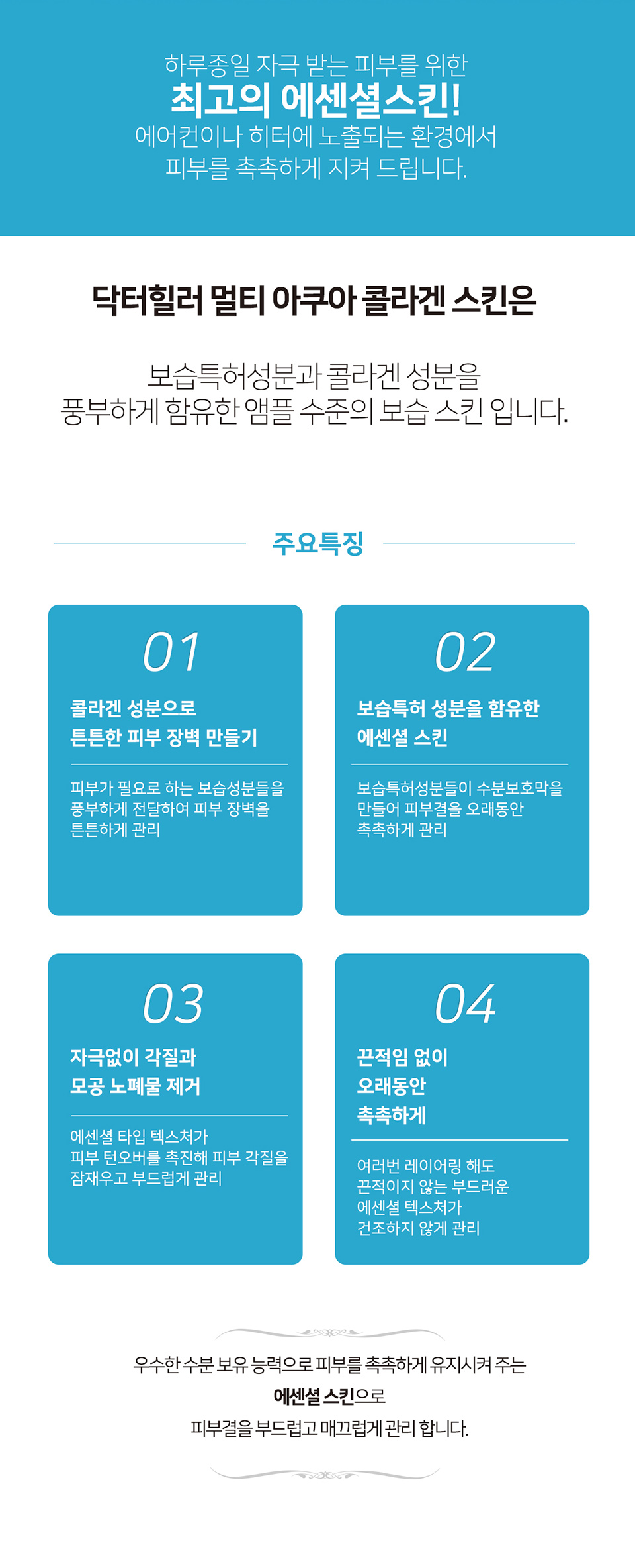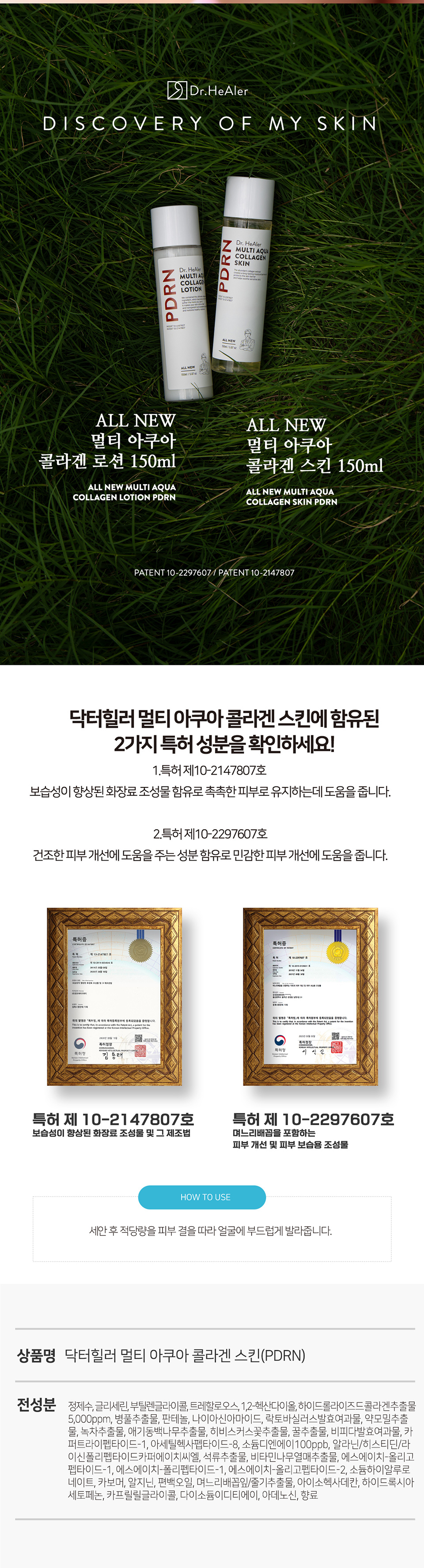 | 전성분 | 정제수, 글리세린, 부틸렌글라이콜, 트레할로오스, 1,2-헥산다이올, 하이드롤라이즈드콜라겐추출물5,000ppm, 병풀추출물, 판테놀, 나이아신아마이드, 락토바실러스발효여과물, 약모밀추출물, 녹차추출물, 애기동백나무추출물, 히비스커스꽃추출물, 꿀추출물, 비피다발효여과물, 카퍼트라이펩타이드-1, 아세틸헥사펩타이드-8, 소듐디엔에이100ppb, 알라닌/히스티딘/라이신폴리펩타이드카퍼에이치씨엘, 석류추출물, 비타민나무열매추출물, 에스에이치-올리고펩타이드-1, 에스에이치-폴리펩타이드-1, 에스에이치-올리고펩타이드-2, 소듐하이알루로네이트, 카보머, 알지닌, 편백오일, 며느리배꼽잎/줄기추출물, 아이소헥사데칸, 하이드록시아세토페논, 카프릴릴글라이콜, 다이소듐이디티에이, 아데노신, 향료 |