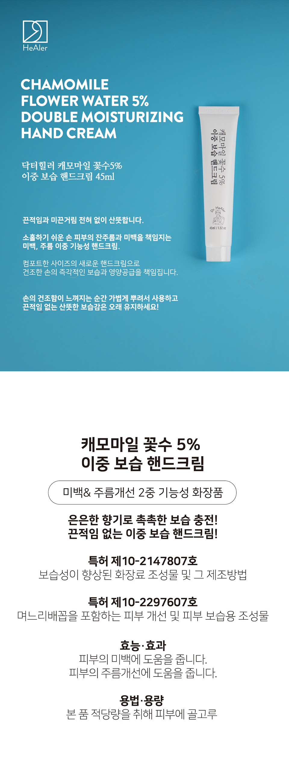 | 전성분 | 정제수, 글리세린, 캐모마일꽃수50,000ppm, 다이프로필렌글라이콜, 카프릴릭/카프릭트라이글리세라이드, 세테아릴알코올, 부틸렌글라이콜, 나이아신아마이드, 1,2-헥산다이올, 하이드롤라이즈드콜라겐, 꿀추출물, 비피다발효여과물, 히비스커스꽃추출물, 소듐디엔에이, 아세틸헥사펩타이드-8, 카퍼트라이펩타이드-1, 소듐하이알루로네이트, 아데노신, 솔비탄올리에이트, 글리세릴스테아레이트, 글리세릴스테아레이트에스이, 피이지-100스테아레이트, 사이클로펜타실록세인, 사이클로헥사실록세인, 아이소헥사데칸,하이드록시아세토페논, 에틸헥실글리세린, 폴리솔베이트60, 폴리솔베이트80, 소듐아크릴레이트/소듐아크릴로일다이메틸타우레이트코폴리머, 카프릴릴글라이콜, 다이소듐이디티에이, 병풀추출물, 폴리글리세릴-4카프레이트, 토코페롤, 며느리배꼽일/줄기추출물,향료, 헥실신남알, 부틸페닐메틸프로피오날, 알파-아이소메틸아이오논, 시트로넬올 |
