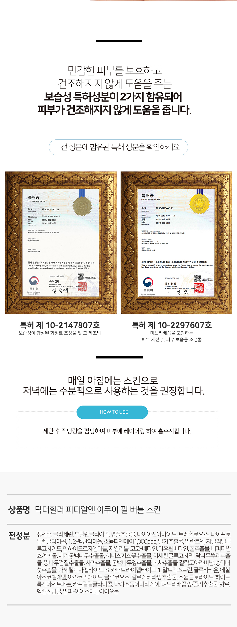 | 사용방법 | 세안 후 토너 단계에서 사용 합니다. 1-2회 펌핑 후 적당량을 피부에 흡수 시킵니다. 건조함이 심하게 느껴지거나 팩으로 사용시 2-3번 정도 바르기와 흡수 시키기를 반복해 줍니다. |