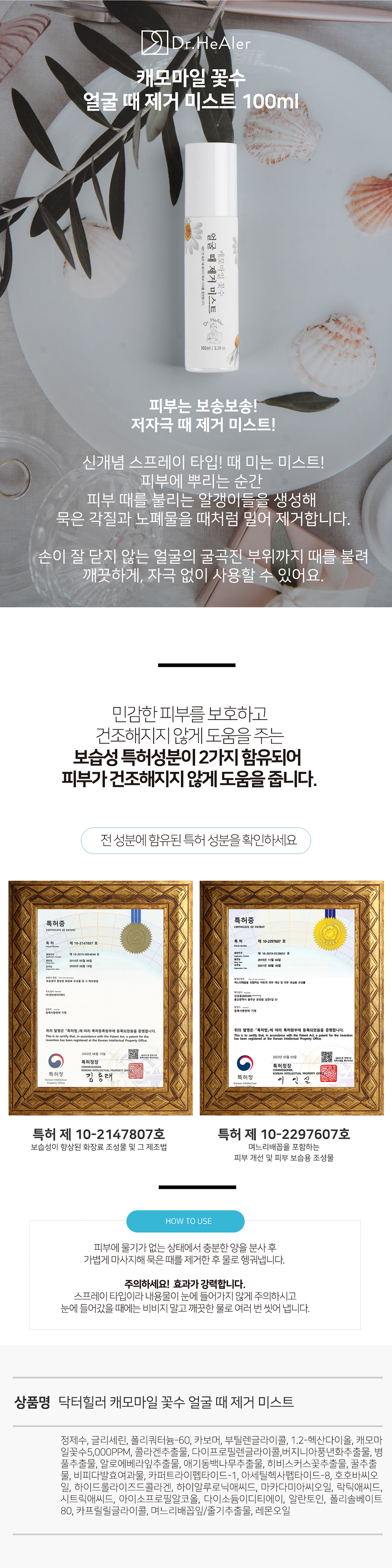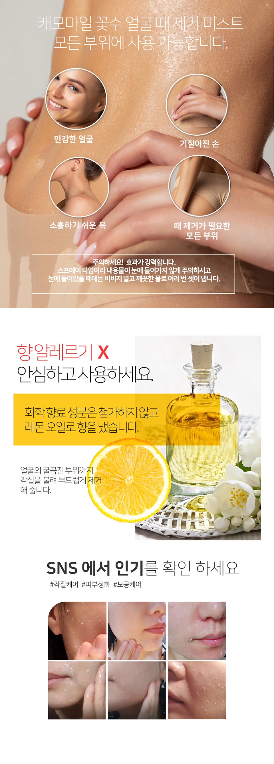 | 사용방법 | 피부에 물기가 없는 상태에서 충분한 양을 분사 후 가볍게 마사지해 묵은 때를 제거한 후 물로 헹궈냅니다. 주의하세요! 효과가 강력합니다. 스프레이 타입이라 내용물이 눈에 들어가지 않게 주의하시고 눈에 들어갔을 때에는 비비지 말고 깨끗한 물로 여러 번 씻어 냅니다. |